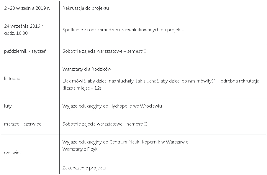 W ramach projektu przewidziano udziału 72 dzieci w podziale na  6 grup ćwiczeniowych (podział wiekowy dzieci). Każda grupa w ramach całego roku zrealizuje 60 godzin zajęć warsztatowych. Wszystkie zajęcia odbywać się będą w soboty w PWSZ w Nysie.
