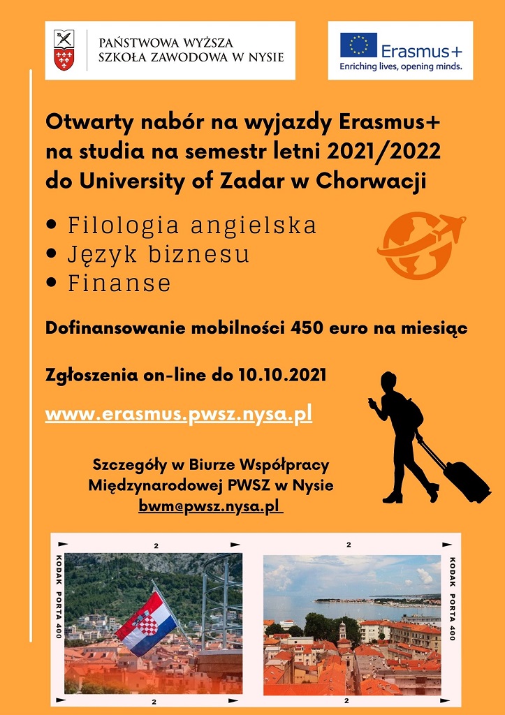 Skorzystaj ze swojego pakietu 12 miesięcy mobilności w ramach programu Erasmus+ i zgłoś się do 10.10.2021 na wyjazd na studia na semestr letni 2021/2022 do University of Zadar w Chorwacji. Oferta dedykowana wyłącznie dla kierunków: