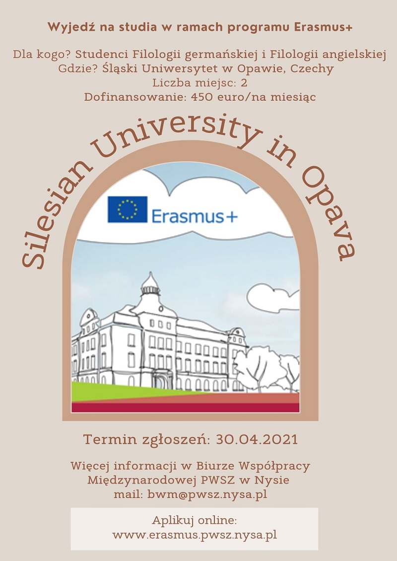 Informujemy o otwartym naborze na wyjazdy na studia w ramach programu Erasmus+ do Silesian University in Opava dla studentów Wydziału Neofilologia, kierunki Filologia angielska i Filologia germańska. Dokumenty aplikacyjne należy składać do dnia 30.04.2021 r. w Biurze Współpracy Międzynarodowej PWSZ w Nysie lub uzupełniając formularz zgłoszeniowy on-line na stronie www.erasmus.pwsz.nysa.pl. W przypadku pytań prosimy o kontakt mailowy bwm@pans.nysa.pl.