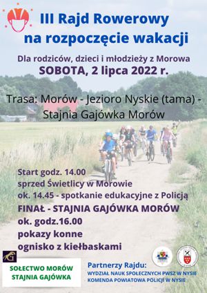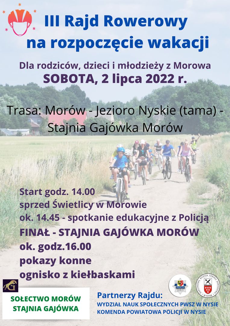 W dniu 2 lipca 2022r. Kadra i studenci Wydziału Nauk Społecznych uczestniczyli w III rajdzie rowerowym na rozpoczęcie wakacji w Morowie. Hasło rajdu "Bezpieczne wakacje" wpisuje się w akcję promocyjną Wydziału Nauk Społecznych. Dla dzieci i młodzieży zorganizowaliśmy spotkanie edukacyjne z funkcjonariuszem Policji z Wydziału Ruchu Drogowego KPP w Nysie.