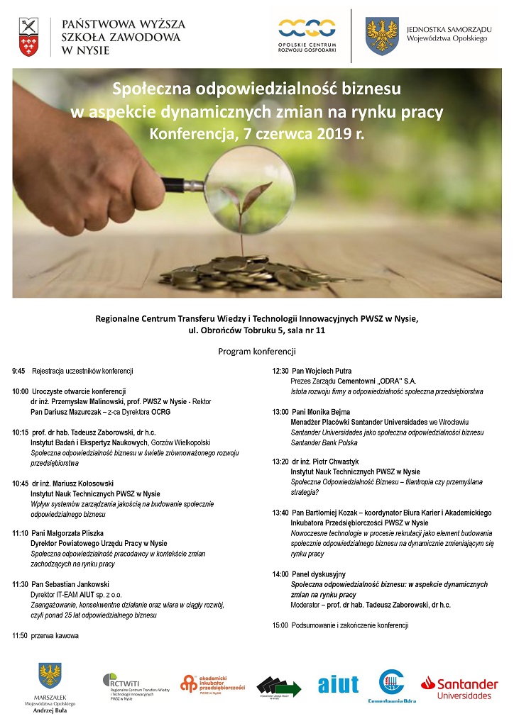W dniu 7 czerwca 2019 r w Regionalnym Centrum Transferu Wiedzy i Technologii Innowacyjnych PWSZ w Nysie spotkają się przedstawiciele czołowych Polskich firm, naukowcy – specjaliści oraz przedstawiciele otoczenia biznesu, którzy wspólnie będą debatować nad tematem społeczność odpowiedzialności biznesu w odniesieniu do zachodzących zmian na rynku pracy.